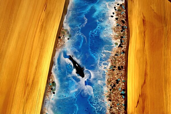 The epoxy resin table is a stunning piece of art that beautifully captures the essence of the ocean. The tabletop is designed to imitate the serene and dynamic movement of ocean waves, with swirling patterns of deep blues and turquoise that mimic the water’s depths. White, frothy waves are artistically crafted, creating a sense of motion as if the ocean is gently lapping against the shore.