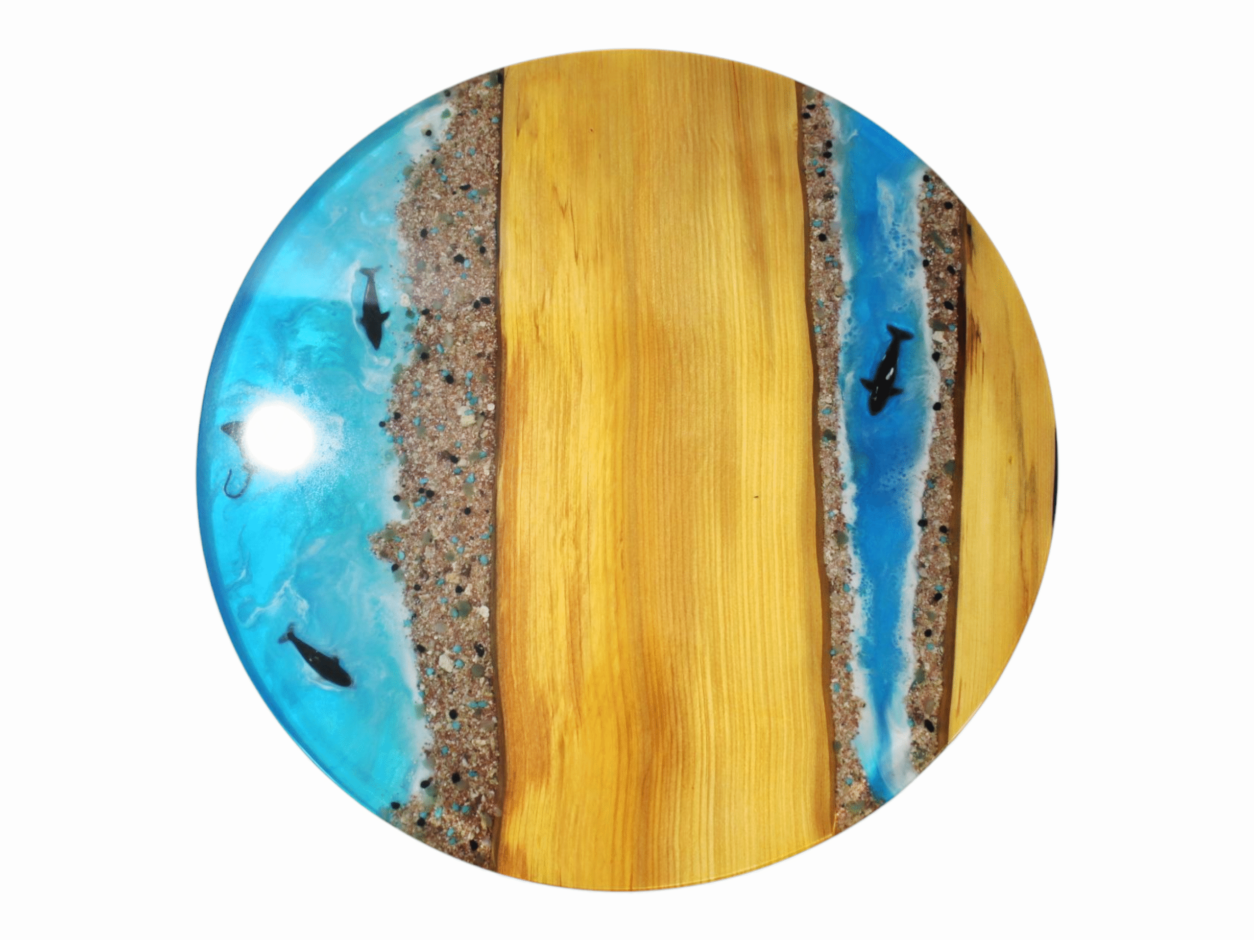 Embedded within the clear resin are various elements of sea life, including colourful fish, delicate starfish, and intricate shells, all meticulously placed to give a vibrant underwater feel. These elements are arranged in a way that makes them appear as though they are swimming through the waves, adding a lively touch to the overall design.